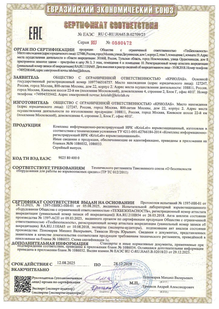 Термометрическое оборудование, производимое OOO «КРИОЛАБ», отвечает всем современным требованиям промышленной безопасности к эксплуатации на объектах нефтяной и газовой промышленности. Точность, надежность и безопасность, подтверждаются соответствующими свидетельствами и сертификатами